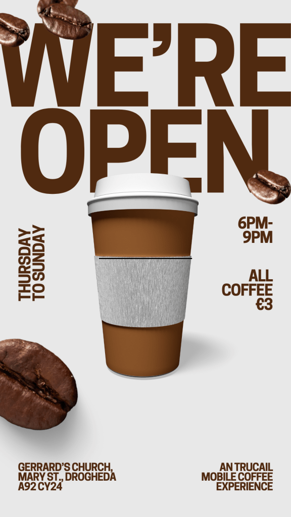 The journey of beansandmore continues to grow beyond the podcast with An Trucail, meaning The Truck, which is a new mobile coffee experience brought to you by beansandmore.coffee, offering a warm and inviting late-night destination for coffee and hot chocolate lovers. Located at Gerard’s Church, Mary Street, Drogheda (A92 CY24), it’s open from Thursday to Sunday, 6 PM to 9 PM and is becoming known for its cozy vibes and top-quality drinks. An Trucail blends community spirit with exceptional service, making it a unique spot to relax, catch up with friends, or simply enjoy a peaceful evening treat. Whether you’re a coffee enthusiast or a hot chocolate fan, An Trucail promises a delightful experience under the stars – It’s a testament to the power of coffee to bring people together, no matter where they are.
